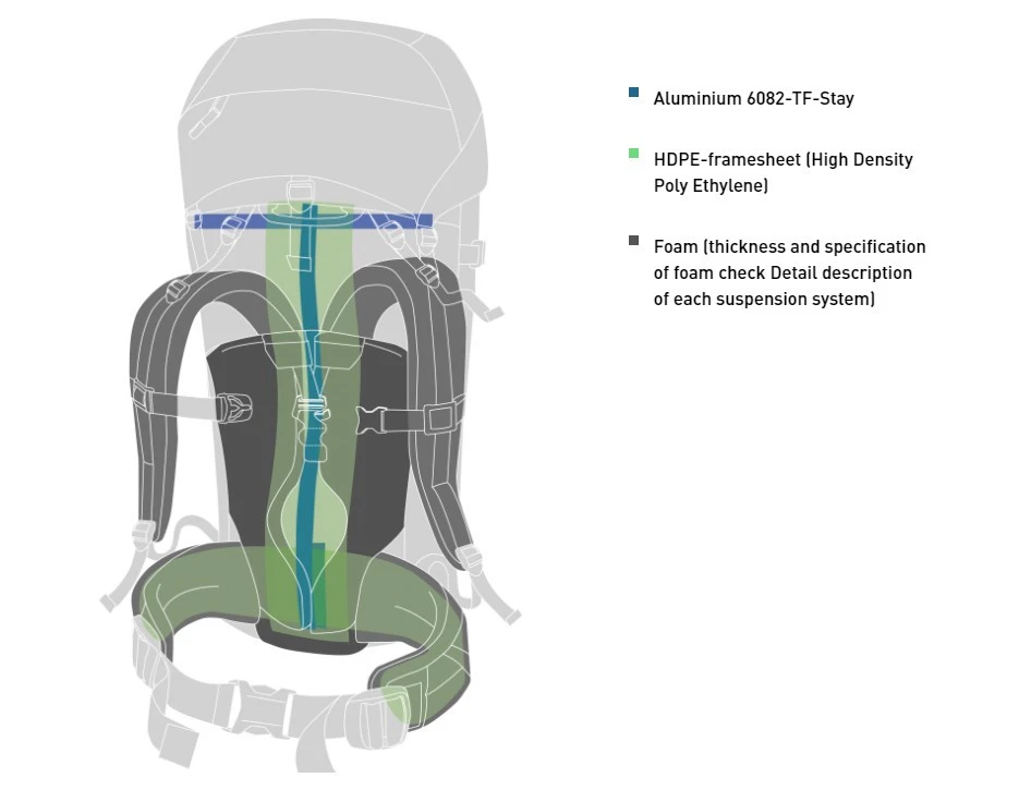L’armature dorsale du Lite Mare 65 est équipée du système de suspension Expedition Lite de Bach. Elle est non réglable en hauteur afin de permettre d’optimiser le poids du sac à dos qui est disponible en deux tailles. Le dos est composé d’un filet tendu et d’une mousse à pores ouverts qui apportent une bonne ventilation et confort optimum, ainsi qu’une plaque dorsale en HDPE (polyéthylène haute densité). Un rail en aluminium, placé sur toute la hauteur du sac à dos, assure un maintien de l’ensemble.